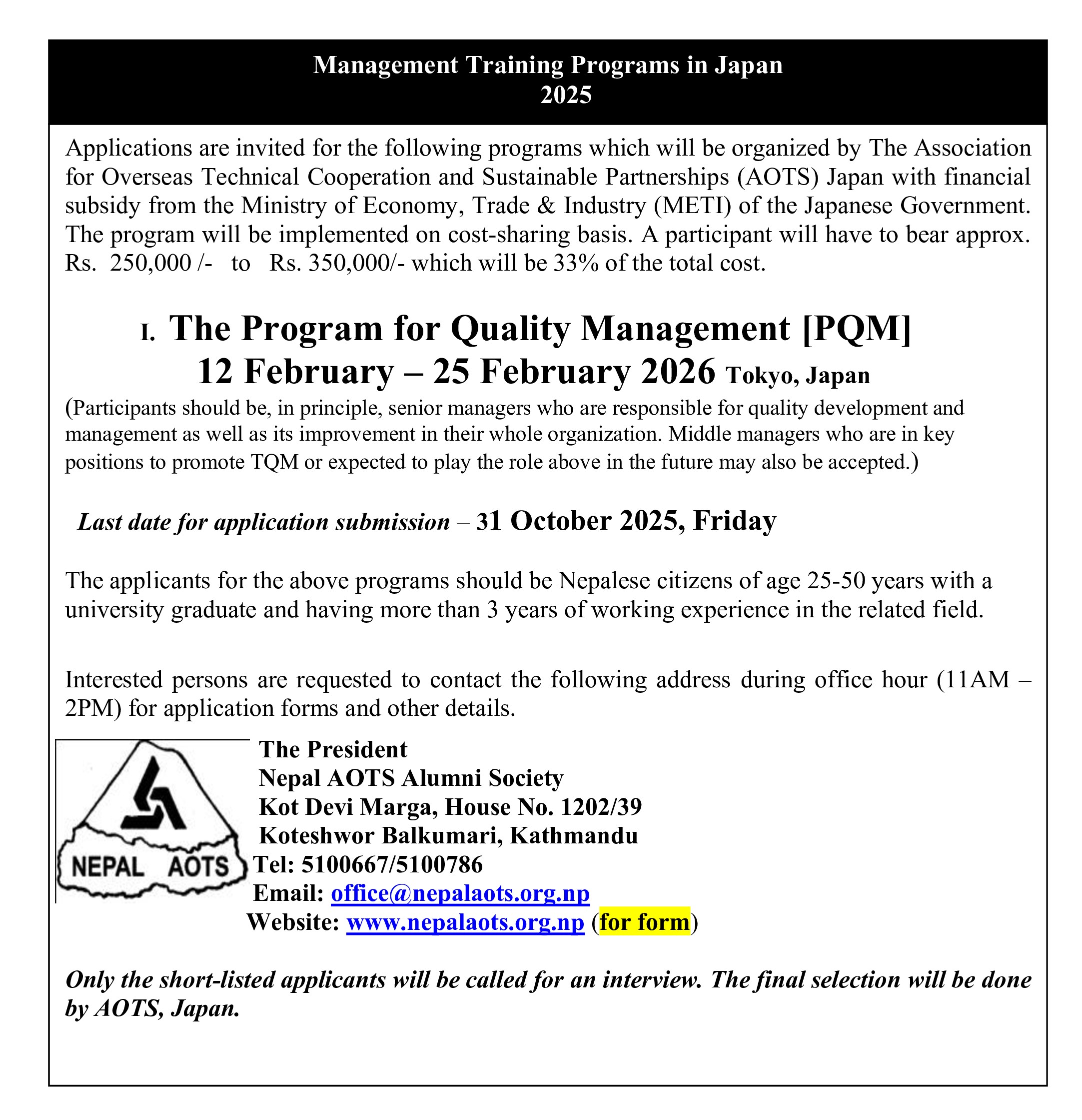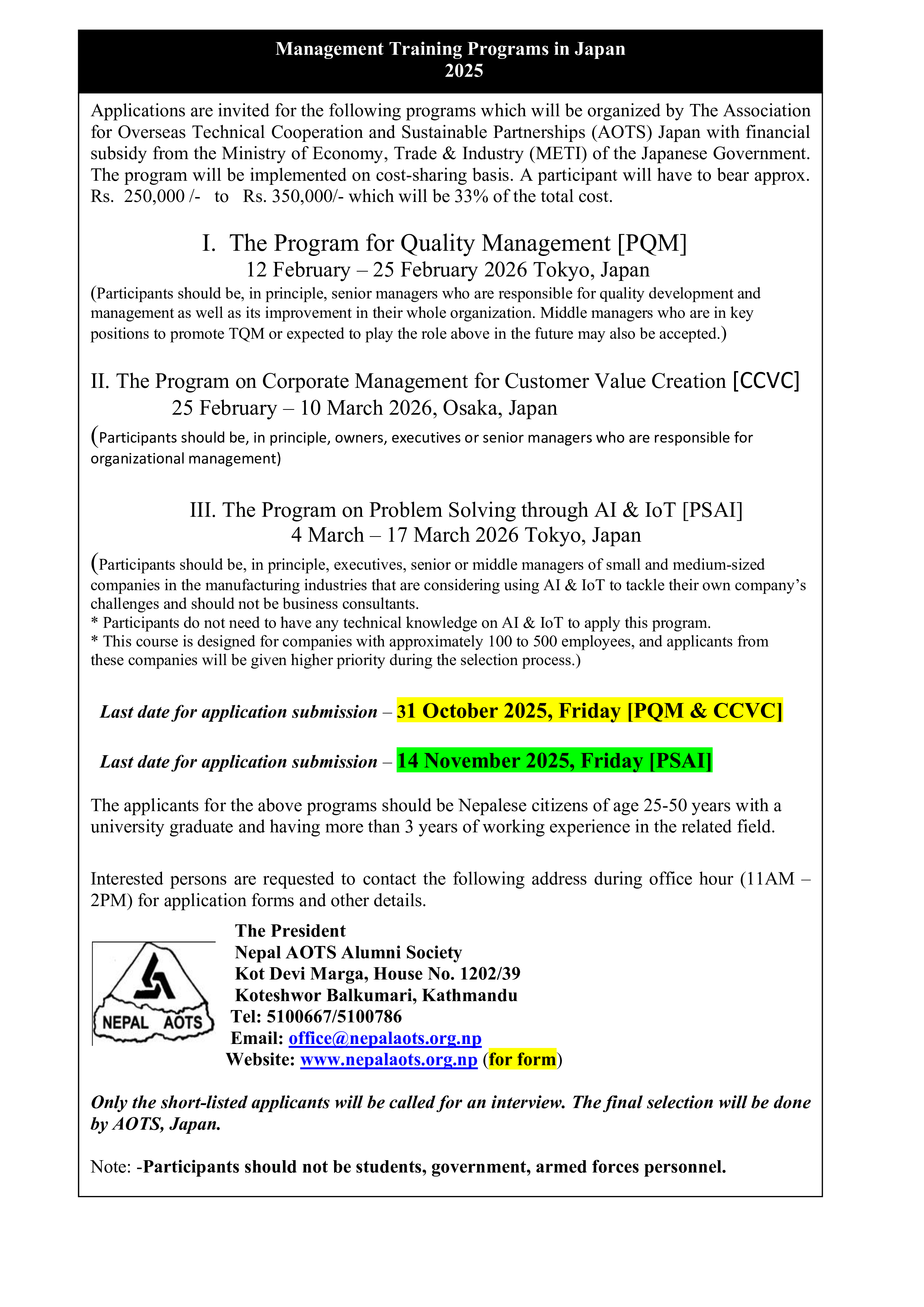 Nepal AOTS Alumni Society (Nepal AOTS) is a non-government and not for profit organization of the ex-trainees of The Association for Overseas Technical Cooperation and Sustainable Partnerships (AOTS) previously known as The Overseas Human Resources and Industry Development Association (HIDA), Center of International Cooperation for Computerization (CICC), Japan and HIDA / AOTS Alumni from different countries. Nepal AOTS was formally established in 1991 with the objective of human resource development in management and technical fields in Nepal through various activities in line with its parent organization, HIDA / AOTS, Japan. Nepal AOTS assists to the private sector of the nation through HRD activities and facilitate their business promotion. By end of 2017, more than 1000 Nepalese have already received training through HIDA / AOTS in Japan and more than 3300 in Nepal itself.
